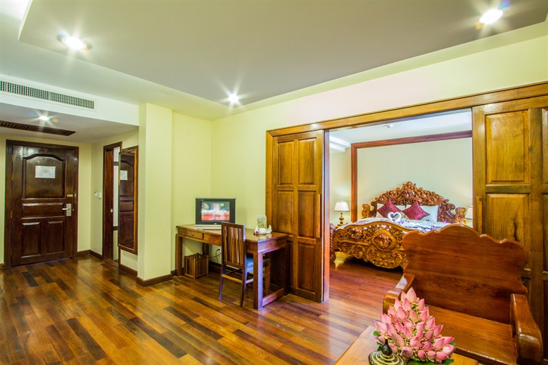 Room features a king bedroom separated from a large living area. Floor-to-ceiling windows offer spectacular views of the poolside courtyard and lush, landscaped grounds.